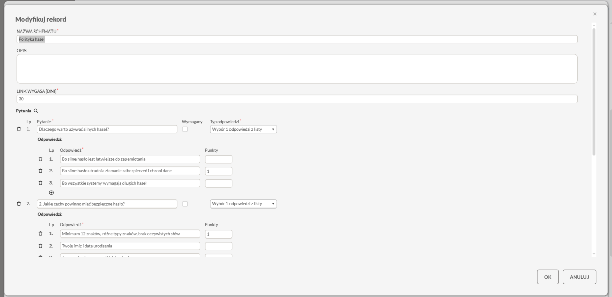 Nowy dodatek w systemie eAuditor. LMS umożliwia tworzenie i zarządzanie ankietami bezpośrednio w module Serwer Wideo LMS. Administratorzy mogą łatwo tworzyć nowe ankiety, przypisywać schematy oraz analizować wypełnione formularze w dedykowanym widoku Serwer wideo (LMS) > Ankiety.