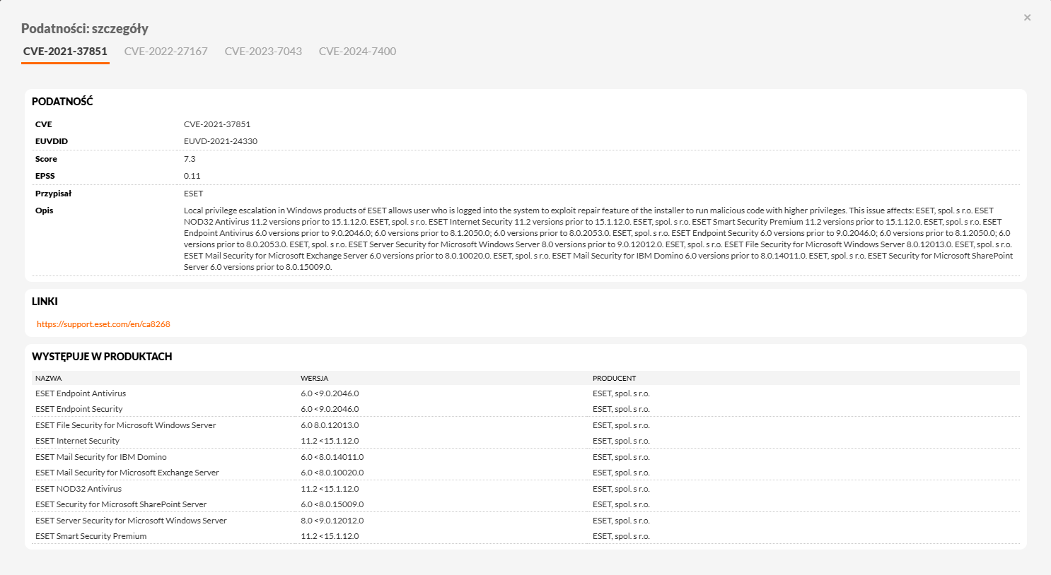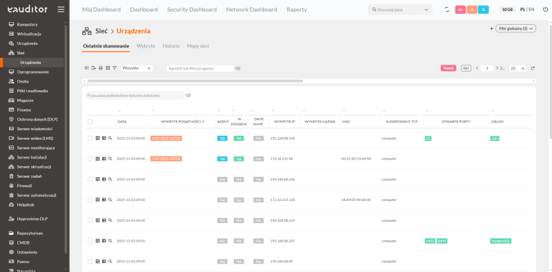 Na podstawie wyników skanowania sieci system automatycznie porównuje wykryte informacje z bazą CVE (Common Vulnerabilities and Exposures), prezentując szczegółowe zestawienie zidentyfikowanych podatności w wynikach skanowania.